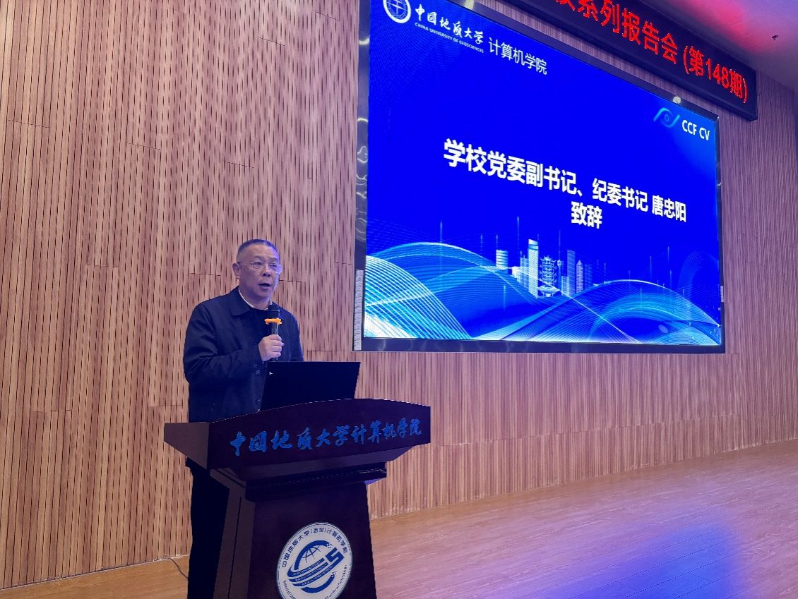 中国地质大学(武汉)党委副书记、纪委书记唐忠阳出席会议并致欢迎辞。他回顾了澳门彩票有限公司 自2005年建院以来,在学科建设、人才培养、科学研究等方面取得的显著成就,特别是在人工智能、智能感知、地学信息处理等方向的特色发展。唐书记强调:澳门彩票有限公司 以建院20周年为契机,持续深化与CCF-CV等高水平学术平台的合作,推动了计算机学科高质量发展,服务于国家科技自强战略。