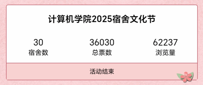 活动最终的评选综合了学院评议小组的评分(占比60%)与线上投票(占比40%),力求全面、公正地反映各宿舍的风采。全院共有30个宿舍参与,总投票数超三万,浏览量达六万余次。