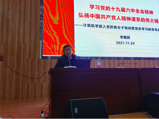 (通讯员:杨书睿)为学习贯彻党的十九届六中全会和习近平总书记七一重要讲话精神,深入推动党史学习教育,11月24日中午,学院党委书记李国昌为澳门彩票有限公司 第29期入党积极分子主讲《学习党的十九届六中全会精神,弘扬中国共产党人精神谱系的伟大精神》专题党课。